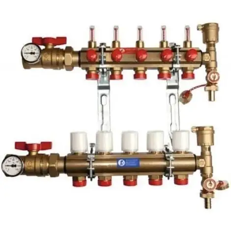 Collecteurs et pilotage pour plancher chauffantKit collecteur prémonté avec débitmètre R553 FK Composition : -1 collecteur 1 » (R553D). -1 vanne multifonction 1 » (26×34) de départ (R269T). -1 vanne multifonction 1 » (26×34) de retour (R269T). -2 boucho Fabrication Européenne