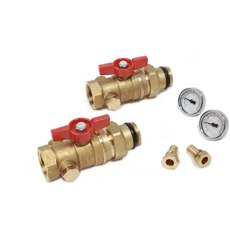 Paire de robinets à tournant sphérique, avec raccords union femelle-mâle, avec thermomètres à contact. Passage normal.