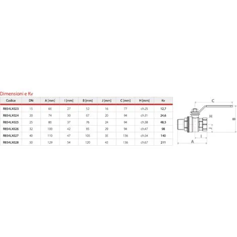 Vanne à sphère avec raccords femelle-mâle. Convient pour l’eau pour les systèmes de chauffage/refroidissement, les gaz non dangereux et les hydrocarbures liquides. En laiton chromé UNI EN 12165 CW617N. Passage total. Poignée à levier en acier avec traitement anti-corrosion et revêtement PVC rouge. Tige de commande avec joint torique à double étanchéité. Écrou avec revêtement anti-corrosion, joint de garantie et hologramme. Température minimale de fonctionnement : -20°C avec des solutions glycolées à 50%. Température maximale de fonctionnement avec vapeur saturée sèche : 185°C avec 1,05 MPa (10,5 bar). Pression maximale de fonctionnement à 20°C avec eau et gaz non dangereux : 3,5 MPa (35 bar) pour 1/2″, 3/4″ ; 2,8 MPa (28 bars) pour 1″, 1-1 / 4″, 1-1 / 2″, 2″. Plage de température avec les hydrocarbures liquides : -20 ÷ 60°C. Pression maximale de service à 20°C avec des hydrocarbures liquides : 1,2 MPa (12 bar).